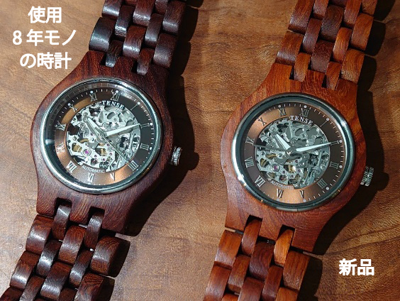 艶熟時愉。 古都京都に代表される年月を経た寺社仏閣などの手すりは参拝者の手に触れることにより丸みを帯び、艶やかな木肌に変化し、落ち着きと風合いを引き出す円熟みを醸しています。 新品のときの凛とした表情も魅力ですが、木の魅力の一つには時とともに熟成され、何とも言えない深みのある艶を纏うことにあります。 一切の染色を施していないテンスの木製腕時計の木肌も同様に、使い込むほどに色は深まり、触れるほどに艶が増し、ひとつとして同じ変化をたどることはありません。 それはまるで、持ち主とともに歳月を重ねるかのような存在。 小さな傷さえも思い出の一部として刻まれ、やがて味わいへと変わっていく―。 木のエージングとは「成熟」。 時間が価値を育てそれを愉しむ。使うほどに、あなただけの個性を映し出す。そんな1本を探してみてください。